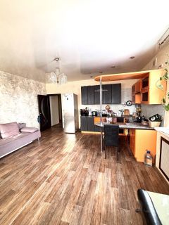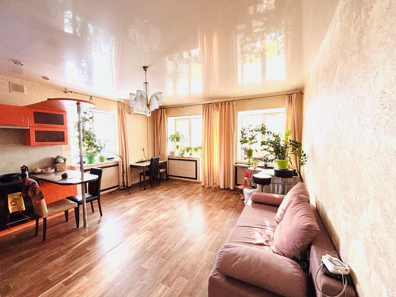 Кухнягостиная (27 м2) — светлая и просторная, с тремя окнами, выходящими во двор. На полу — практичный линолеум, установлен кондиционер. Идеальное место для семейных ужинов и встреч с друзьями.