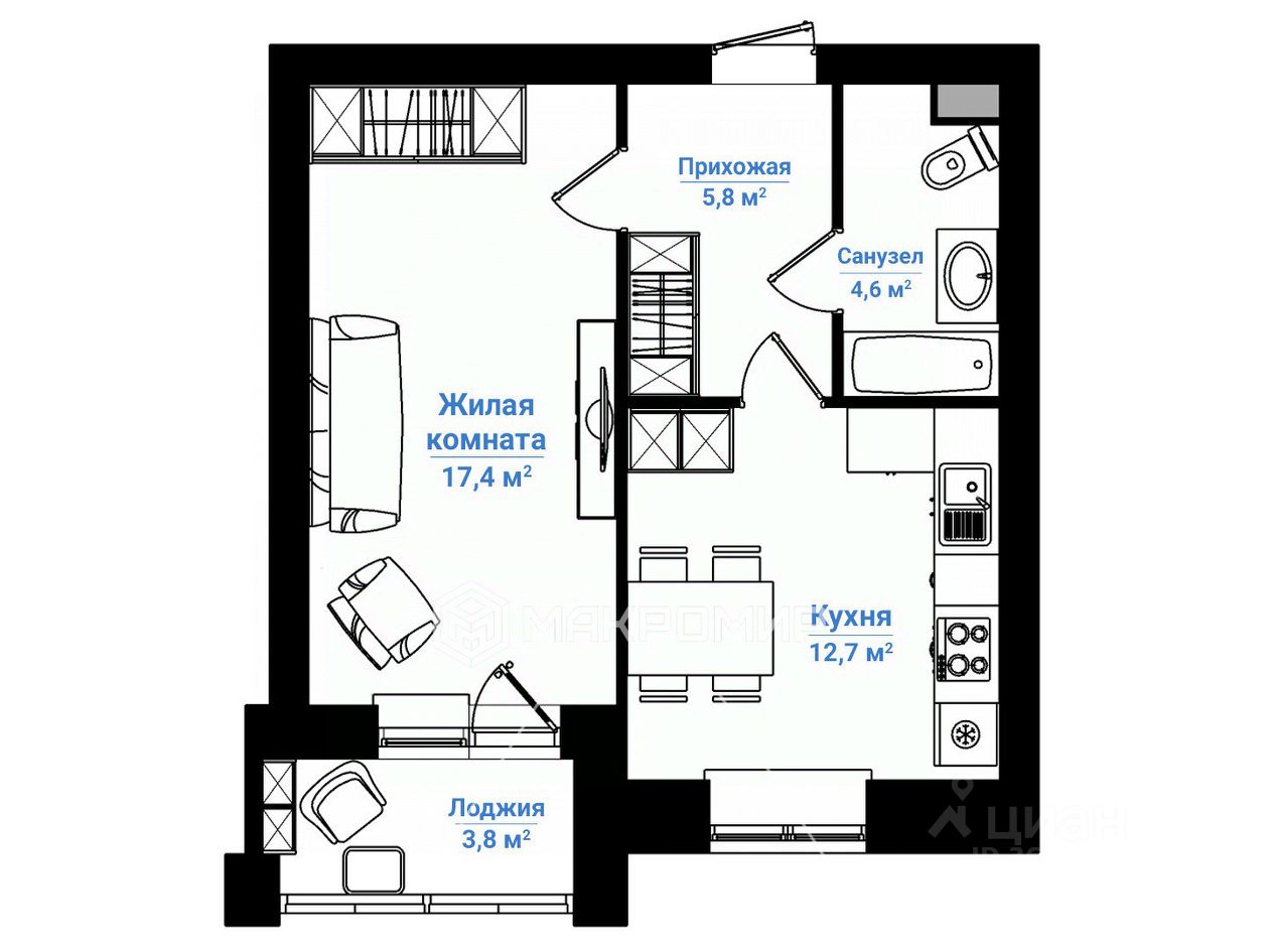 Планировка для жизни. Комната 17,4 м² — отдых и рабочее место. Отдельная кухня 12,7 м² — место под стол и зону готовки. Хранение продумано: система в прихожей + шкаф в комнате.