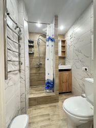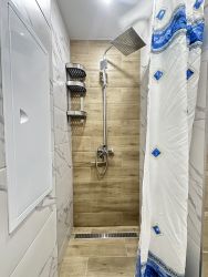 В санузле сделан ремонт по индивидуальному дизайнпроекту. Место душевой выложено плиткой , установлен тропический душ.