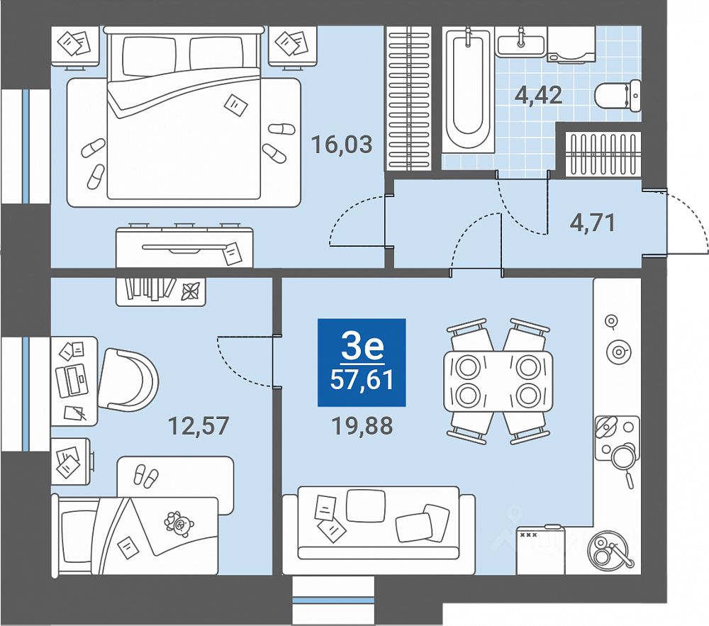 3-комн. от 57,61 м²