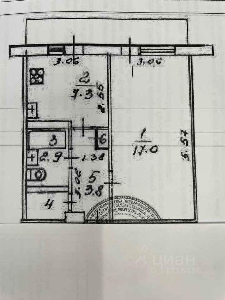 Общая площадь квартиры 32,5 кв.м., комната 17 кв.м,, 7,3 кв.м. кухня