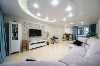 - Потолки: сочетание гипсокартоновых конструкций и натяжных полотен с точечными светильниками; в детской — штукатурка и покраска.