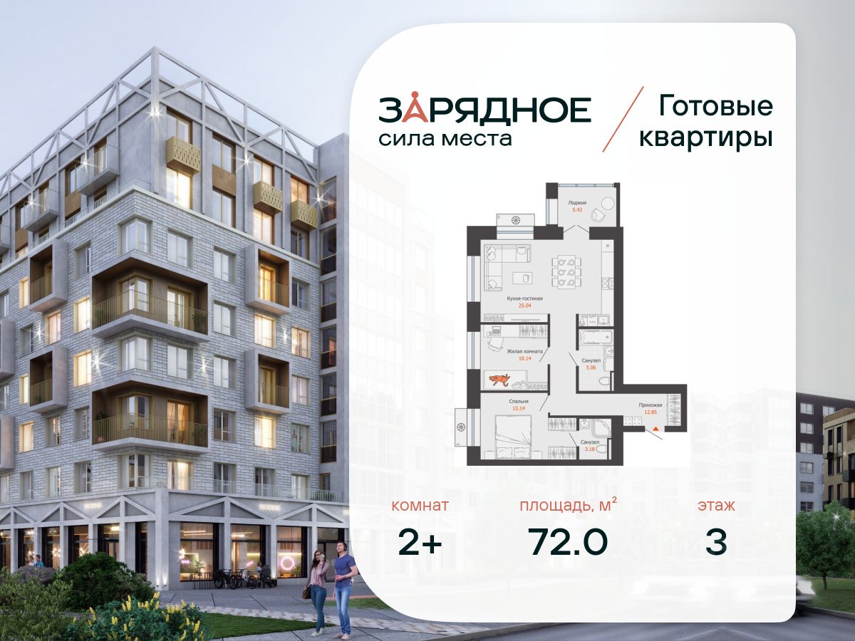 Продается 2-комнатная квартира, корпус 5, площадь 72.00 кв. с предчистовой отделкой. Квартира находится в жилом комплексе комфорт-класса "Зарядное" (ГК "Железно").