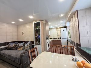 Квартира находится в тихом и спокойном районе Кирова. Общая площадь квартиры 59 кв.м, 2 комнаты изолированы 17,7 и 14,1 кв.м, кухня- гостиная 17 кв.м, сан.узел совмещен 5 кв.м. В квартире сделан ремонт, поменены все окна, натяжные потолки, пол ламинат, установлены новые входные и меж.комнатные двери, сан.узел в кафеле.