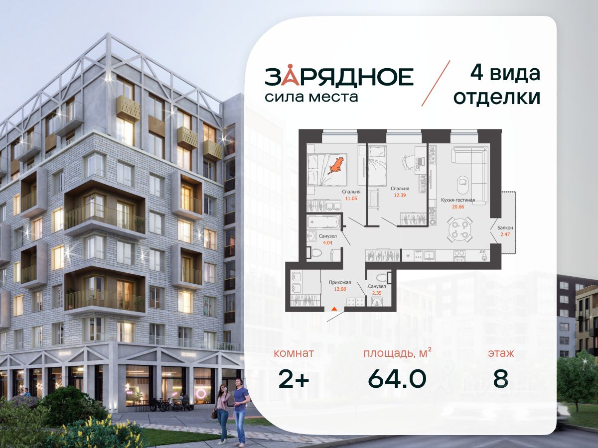 Продается 2-комнатная квартира, корпус 4/2, площадь 64.00 кв. Квартира находится в жилом комплексе комфорт-класса "Зарядное" (ГК "Железно").