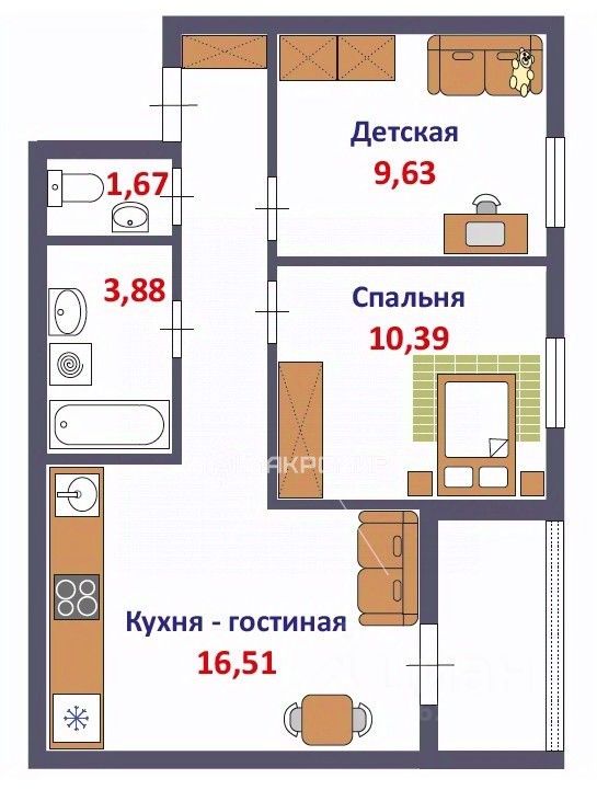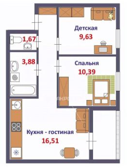 Две спальни, каждая около 10 метров, + кухня - гостиная (16,5 метров).