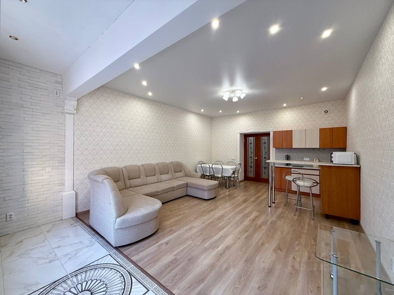 Продуманное зонирование напольного покрытия: в жилой зоне и кухне влагостойкий ламинат высокого качества - он отличается высокой прочностью и устойчив к воздействию влаги, а также приятен на ощупь и создаёт уют.