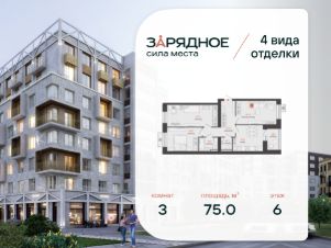 Продается 3-комнатная квартира, корпус 4/1, площадь 75.00 кв. Квартира находится в жилом комплексе комфорт-класса "Зарядное" (ГК "Железно").