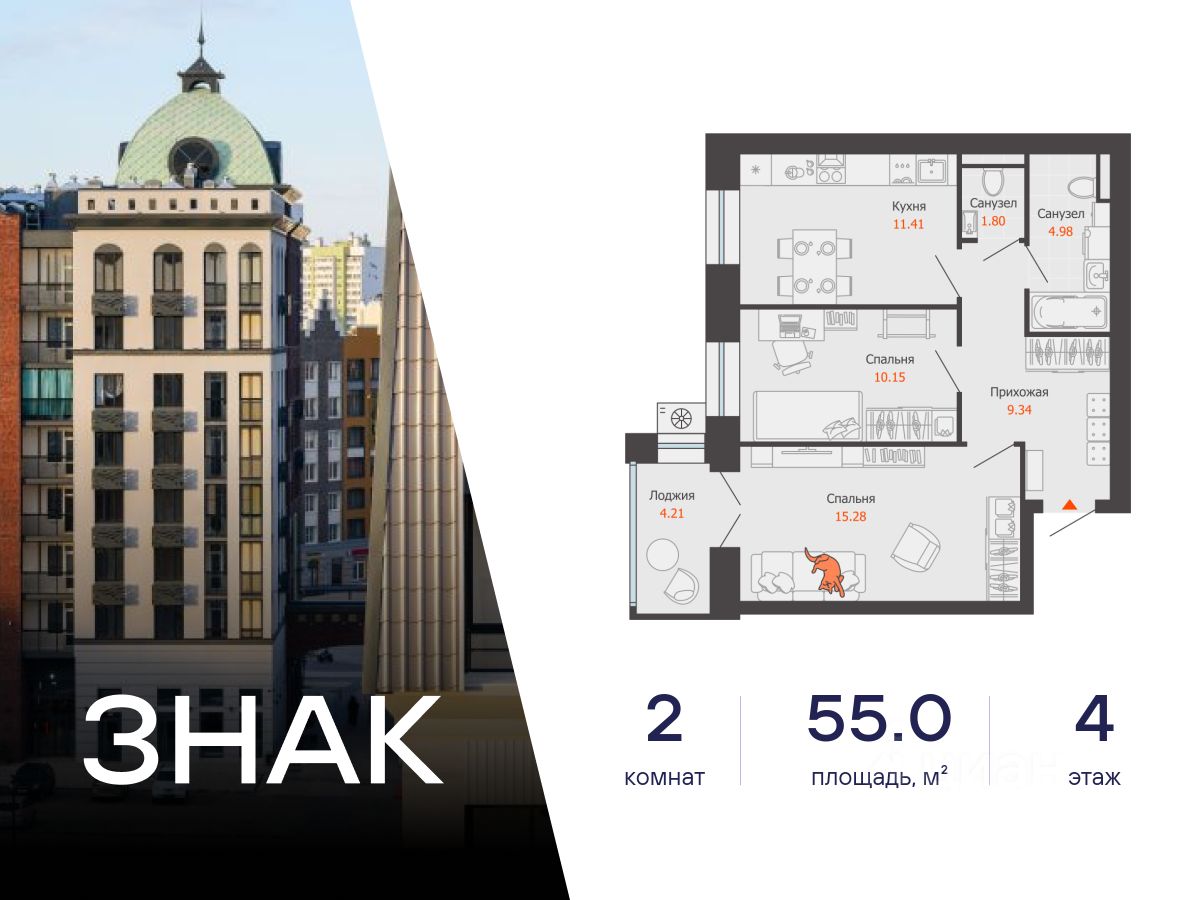 Продается 2-комнатная квартира в 3 км от Зубаревского леса, площадью 55.00 кв. м. Квартира находится в жилом комплексе комфорт-класса ЗНАК от девелопера "Железно".