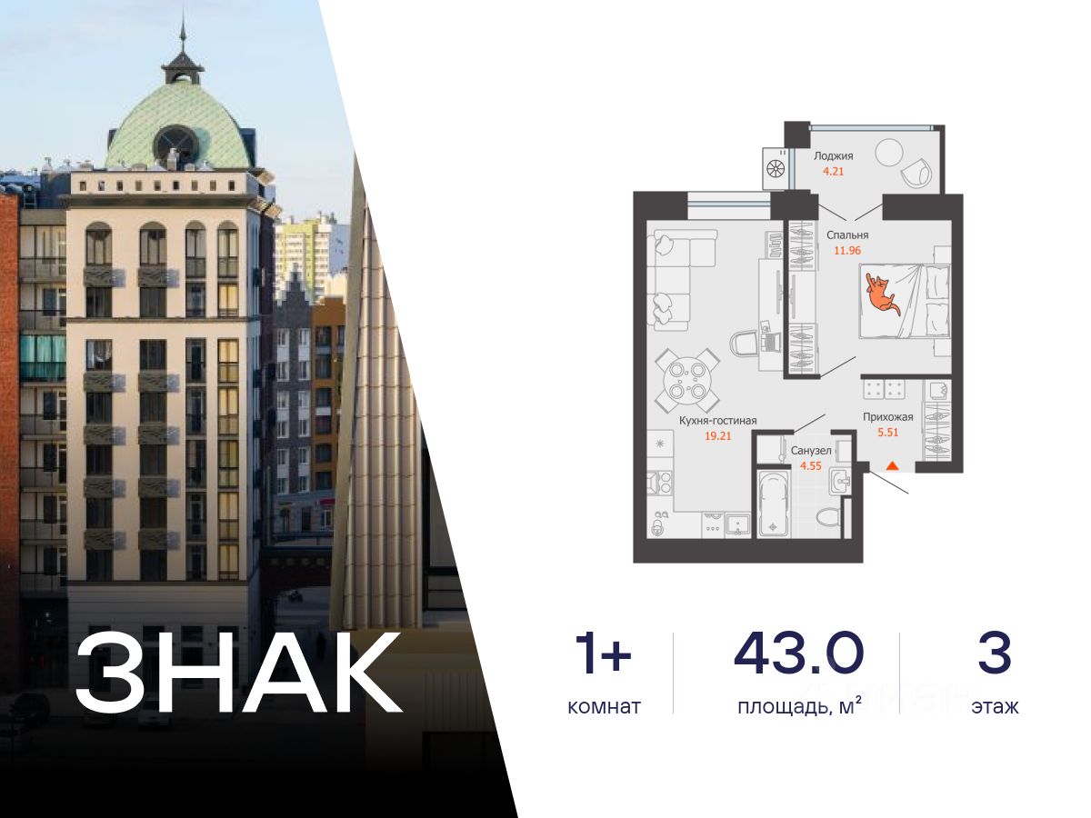 Продается 1-комнатная квартира в 3 км от Зубаревского леса, площадью 43.00 кв. м. Квартира находится в жилом комплексе комфорт-класса ЗНАК от девелопера "Железно".