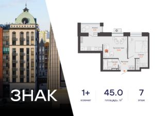 Продается 1-комнатная квартира в 3 км от Зубаревского леса, площадью 45.00 кв. м. Квартира находится в жилом комплексе комфорт-класса ЗНАК от девелопера "Железно".