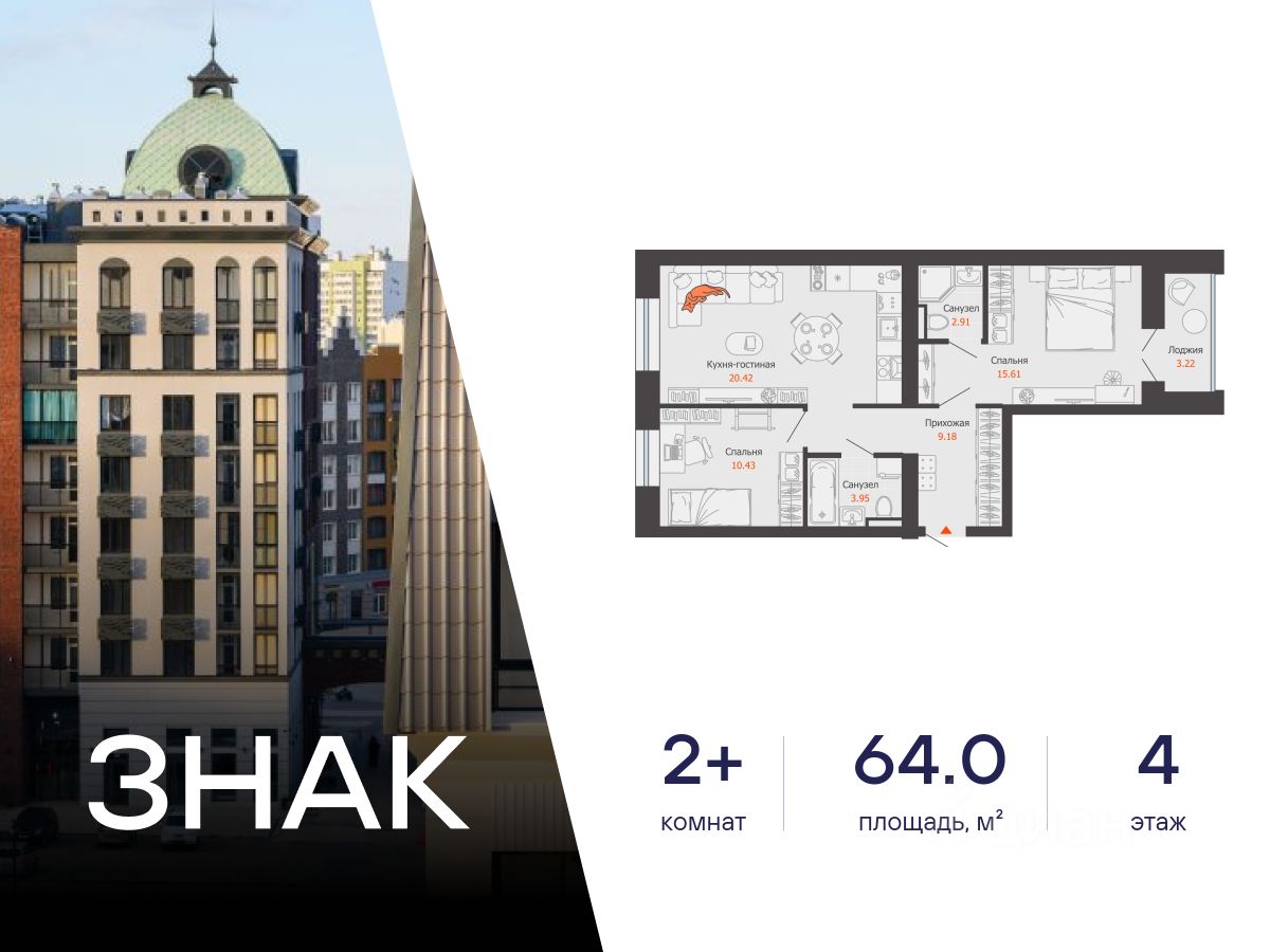 Продается 2-комнатная квартира в 3 км от Зубаревского леса, площадью 64.00 кв. м. Квартира находится в жилом комплексе комфорт-класса ЗНАК от девелопера "Железно".