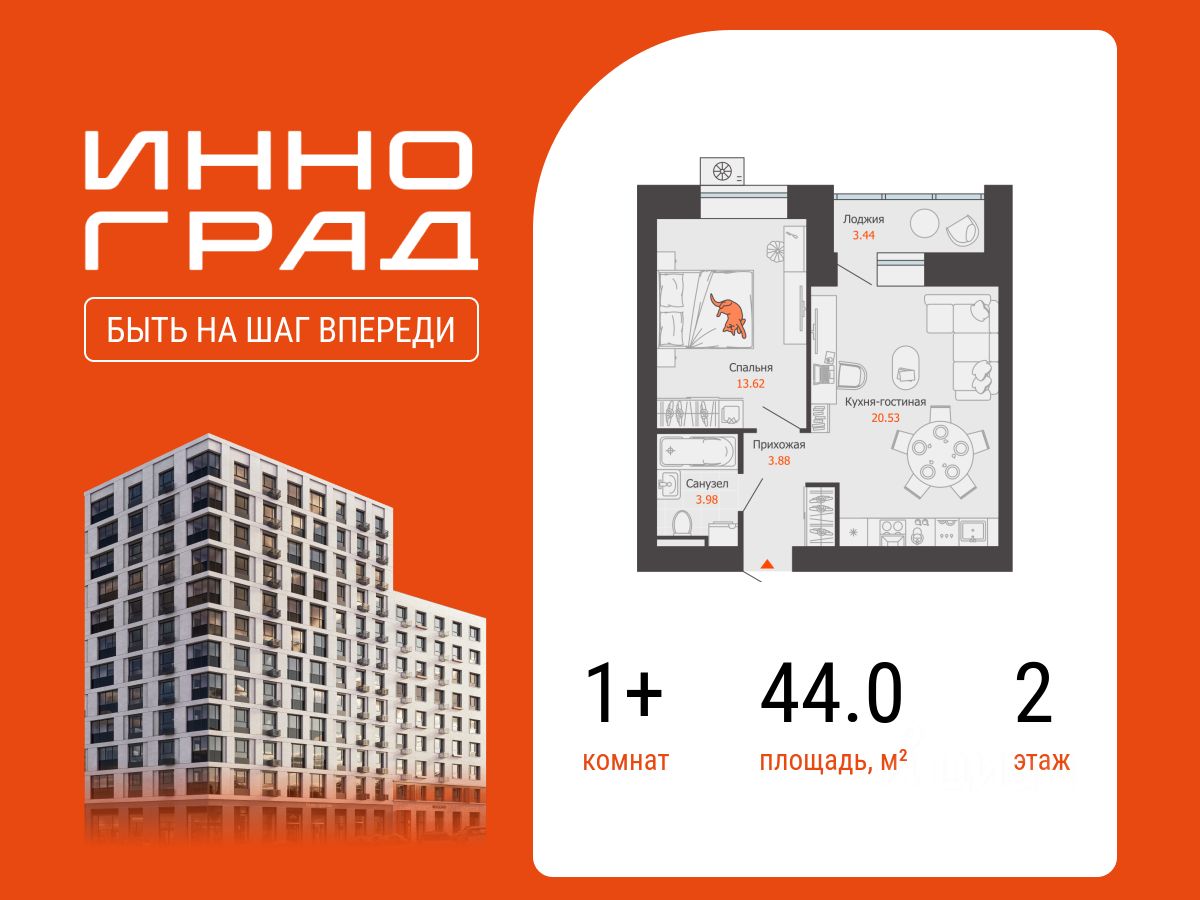 В уютном районе Кирова продается 1-комнатная квартира площадью 44.00 кв. м с отделкой white box. Квартира расположена в новом жилом комплексе комфорт-класса "Инноград" от девелопера "Железно". "Инноград" - это больше, чем просто жилой комплекс. Это полноценный город в городе, где всё необходимое для насыщенной жизни, работы и отдыха находится в шаге от вашего дома. Транспортная доступность • 1 остановка общественного транспорта и 3 автобусных маршрута; • 10 минут на машине до Ж/Д вокзала; • 15 минут до центральной улицы Ленина; • 17 минут до набережной реки Вятки. Архитектура с характером Динамичный и современный облик "Иннограда" формирует архитектурное разнообразие. Здесь уютная среднеэтажная застройка сочетается с выразительными высотными доминантами. Дома возводятся из кирпича - проверенного временем материала, обеспечивающего долговечность, превосходную шумоизоляцию и здоровый микроклимат в каждой квартире. Высотные кирпичи возводятся по современной монолитной технологии, что позволяет создавать здания со свободной планировкой и впечатляющей архитектурой. Благоустройство и удобство Ваш дом - ваша крепость. В "Иннограде" эта идея воплощена в концепции закрытых дворов. Это приватные и безопасные пространства только для жителей, где вы и ваши дети можете наслаждаться спокойствием и комфортом, будучи на шаг впереди городской суеты. Красоту ландшафта подчеркивает озеленение и МАФы. Центром социальной жизни "Иннограда" станут две общественных площади для встреч, прогулок и общения, а также инновационный плейхаб для активного отдыха жителей всех возрастов. Инфраструктура для жизни и бизнеса • Собственный бизнес-центр, ФОК и медицинский центр; • Соседский центр, коворкинг и Школа искусств; • Два встроенных детских сада на 280 мест и отдельно стоящий на 320 мест; • Новая современная школа на 1500 учеников; • Встроенная коммерция на первых этажах.