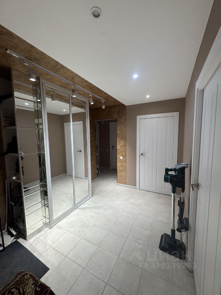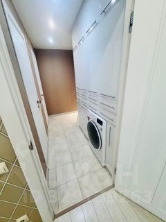 Большая прихожая и коридор. Зеркальный шкаф-купе в прихожей, в коридоре вместительный шкаф с фасадами из белого стекла, место под стиральную машину.