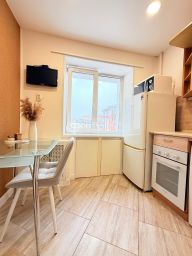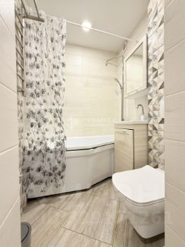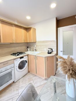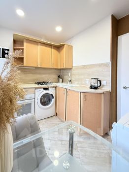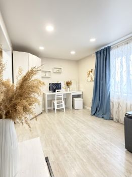 Здесь уже выполнен свежий ремонт: пол залит стяжкой, в комнате уложен ламинат, в остальных помещениях - плитка, установлен натяжной потолок. Остаётся кухонный гарнитур со встроенной техникой, холодильник, стиральная машина и водонагреватель - можно сразу заселяться и жить.