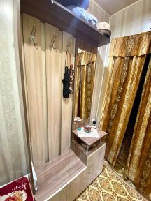 В прихожей выделена зона гардеробной для хранения одежды, двойная входная дверь,