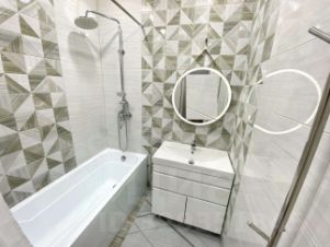 ванна в кафеле, с качественной сантехникой и комплектующими, с местами для хранения. Стоят счётчики на воду