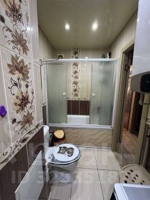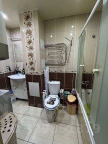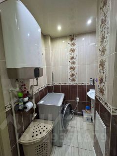 Совмещённый санузел в красивой кафельной плитке, установлен водонагреватель, комфортное размещение стиральной машины.