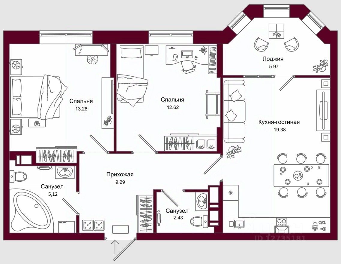 - Два санузла: совмещённый 2,46 м² и гостевой 5,12 м² — идеально для семьи и приёма гостей.