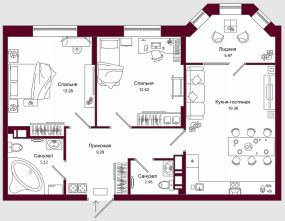 - Две жилые комнаты: 13,28 м² и 12,62 м².