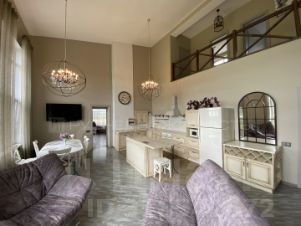 Первый этаж - просторная кухня-гостиная площадью 44,4 м2 с двойным светом и высотой потолка 5,4 м, три изолированные комнаты 37,5; 24,3 и 17,1 м, три санузла, две гардеробные, прачечная.
