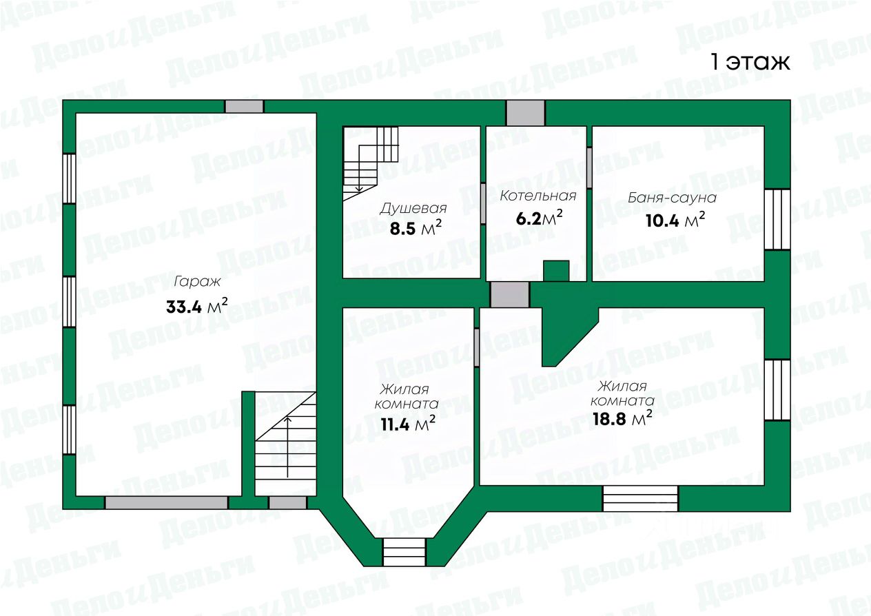 Первый этаж: материал стен - кирпич, комната-отдыха с камином, баня-сауна, спальня.