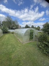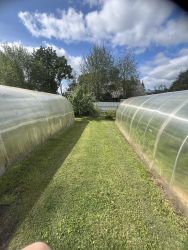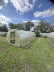 Две теплицы с системой капельного полива, летний душ с электроподогревом.