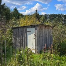 - На участке летний домик из бревна, крыша - профнастил, сарай