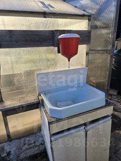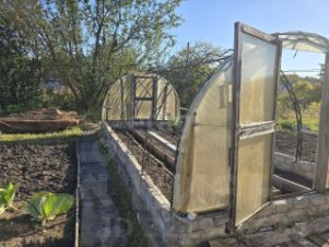 На участке установлены две теплицы для раннего урожая, высажены ягодные кустарники, малина, клубника и плодовые деревья, включая яблони.