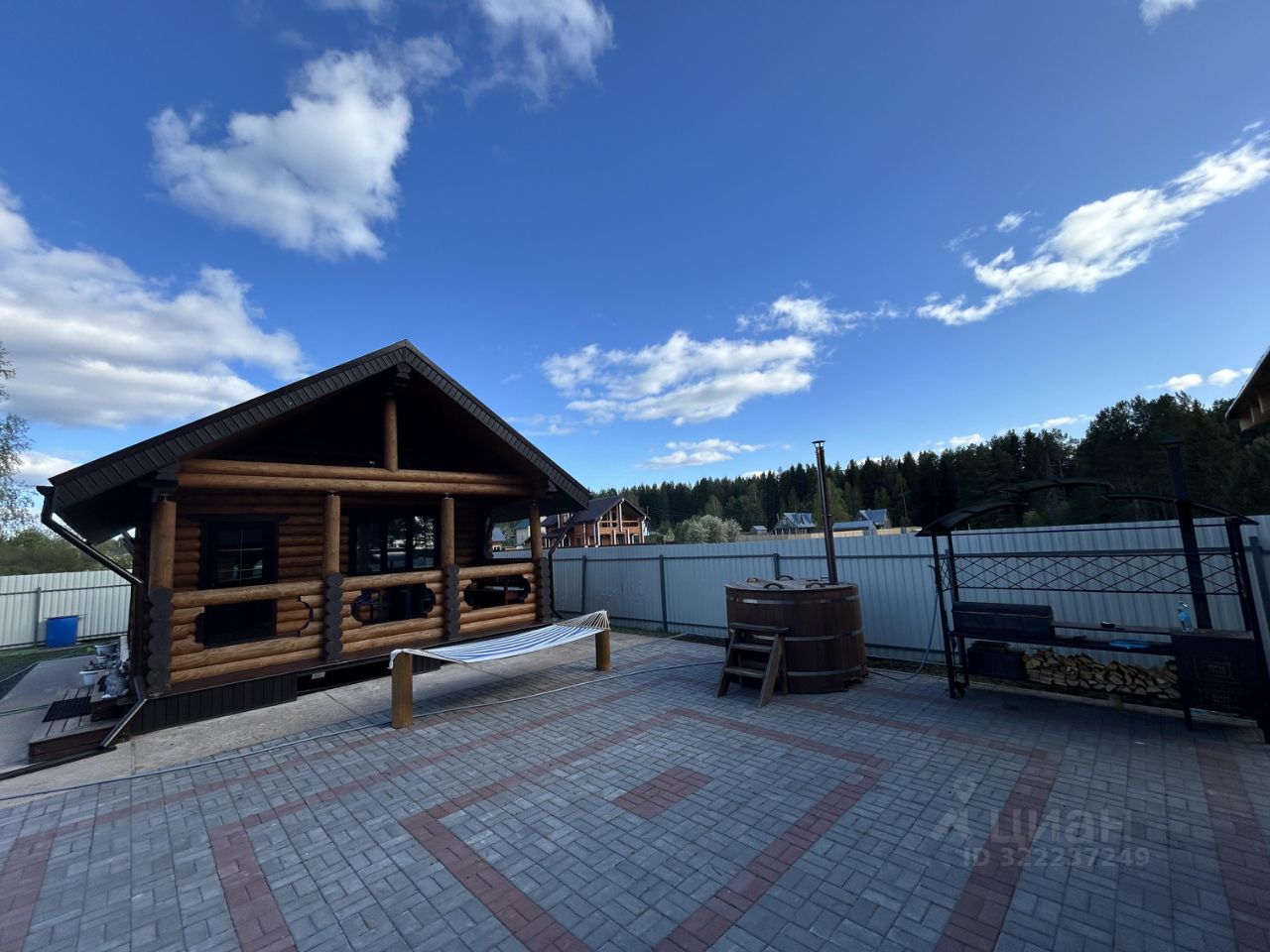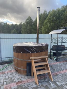 Благоустроенная площадка для отдыха и барбекю между баней и беседкой площадью 70 м2, покрытие из брусчатки, на площадке горячая Купель фурако и гриль-зона (мангал+печь для казана).