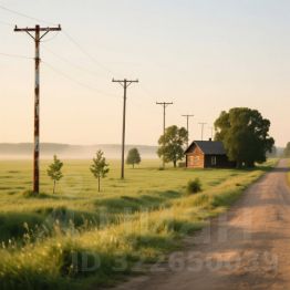 Асфальтированная дорога , столбы электричества на участке.