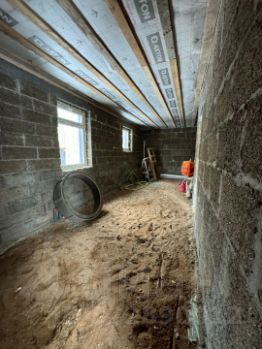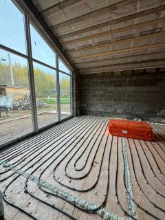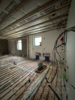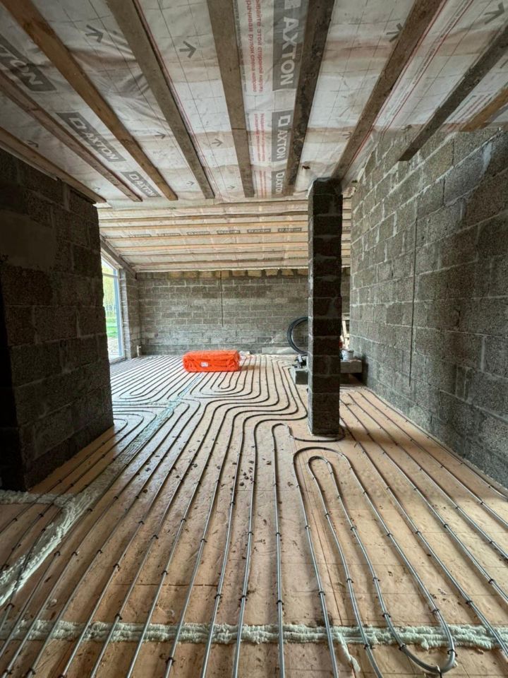 Залита стяжка, теплые полы, установлено газовое оборудование , оштукатуривание стен, отмостка утепленная, лестница на второй этаж, проведено электричество, подготовленно песчаное основание под брусчатку.