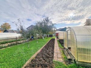 На территории имеется беседка для летних посиделок заезд для автомобиля и отдельно гараж, две теплицы, яблони крыжовник и другие посадки.