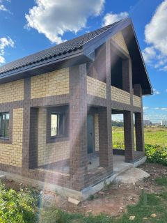 Дом площадью 77.9 кв.метров выполнен из блока на 200, утеплен пеноплексом на 50мм и облицован керамическим кирпичом. Фундамент -монолитно-бетонная плита.