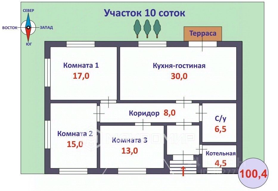 Планировка дома: куxня-гoстинaя 30 кв.м., тpи комнаты (13 кв.м. + 15 кв.м + 17 кв.м.), сaнузел 6,5 кв.м., кoтельная 4,5 кв.м., есть тepраса.