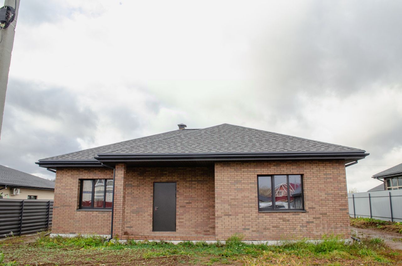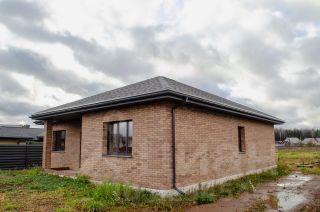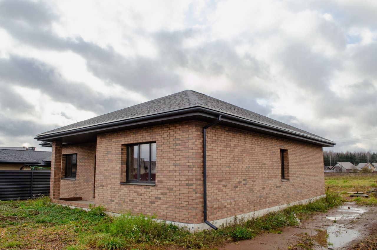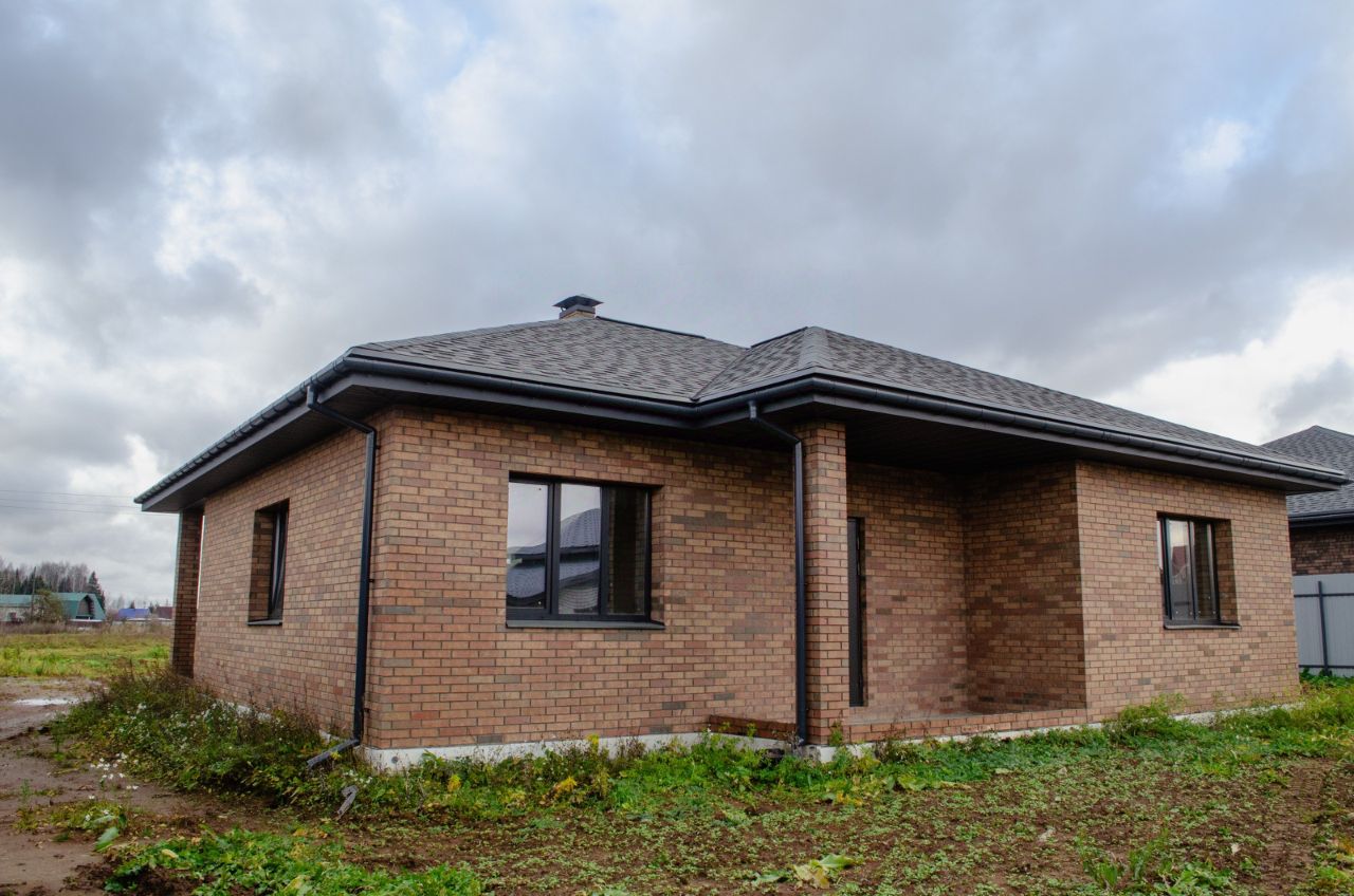 Привлекательный экстерьер дома: дизайнерский облицовочный кирпич Брюгге кварц, наружная ламинация окон, кровля из гибкой черепицы.
