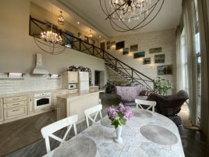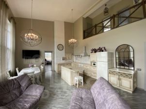 Первый этаж - просторная кухня-гостиная площадью 44,4 м2 с двойным светом и высотой потолка 5,4 м, три изолированные комнаты 37,5; 24,3 и 17,1 м, три санузла, две гардеробные, прачечная.