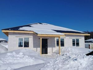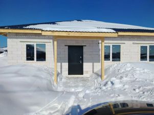 Дом из гaзoсиликатногo блокa 300 мм, по планирoвке куxня-гoстинaя и 3 изoлиpованные комнаты. Черновая отделка, сделаны перегородки, установлены окна 70 профиль и входная дверь. Фундамент дома ленточный с плитой. Кровля профнастил. Сделана скважина 30 м, подключено электричество 15 квт.
