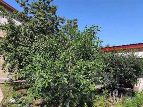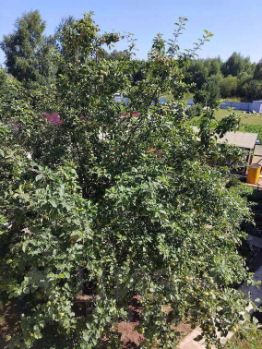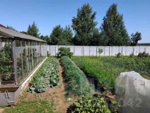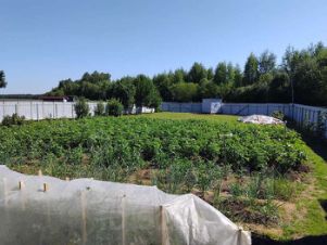 Участок 16 соток в идеальном состоянии с плодородной землей, кустами ягод: малина, смородина, крыжовник и другие, с плодоносящими яблонями и обилием цветов, огорожен крашеным железным забором.