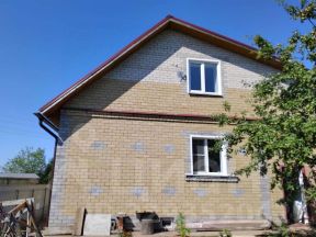 • Стены газосиликат 40 см и облицовка желтым кирпич - итого ширина стены 54-55 утеплитель пенофлекс на грибы в 2 слоя , запененные швы, гипсокартон - всё сделано по технологии.