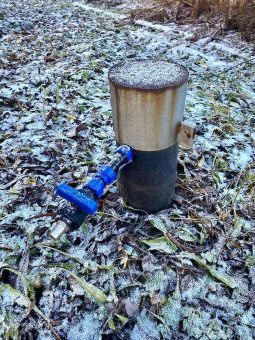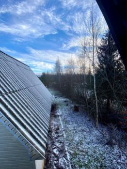 Забор из профнастила с открывающимися воротами для заезда машины, частично - деревянный,Есть бочка для сжигания мусора.