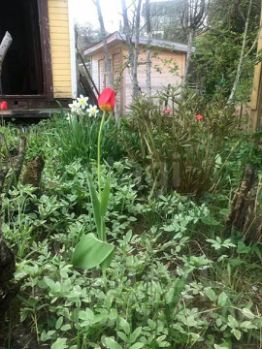 На участке растут и плодоносят многолетние деревья (яблоня, слива, вишня, калина), а также множество декоративных кустарников и цветов.