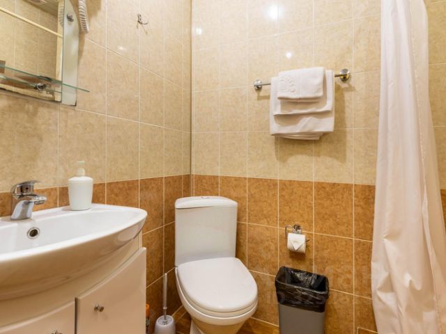 Оснащение: вешалка с тумбой в прихожей, мини-холодильник, чайная пара, чайник, рабочий стол и стулья, телефон, телевизор, кондиционер, блэкаут шторы, двуспальная кровать или две раздельных кровати в комнате; раковина, зеркало, гигиенические средства, унитаз, душевая кабина, махровые халаты и тапочки, набор полотенец в ванной комнате.