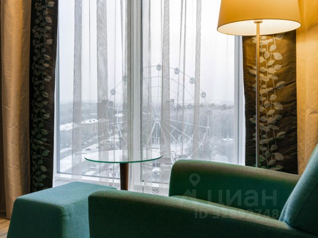Вдохновляющая панорама. Из панорамных окон открывается захватывающий вид на колесо обозрения, городской парк и пруд с сезонными фонтанами. Утром мягкий свет над водной гладью и ощущение тишины, вечером огни города и спокойствие над суетой улиц. Это создает особую атмосферу уединения в центре города.