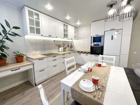 С современным ремонтом в квартире свободно размещаются до 4 человек: большая 2-спальная кровать king-size с ортопедическим матрасом средней жесткости и удобными подушками + широкий раскладной диван на двоих.