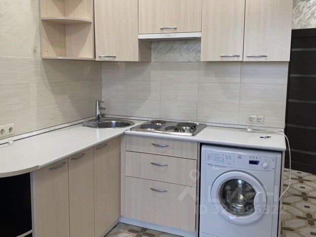 В зоне кухни: кухонный гарнитур, со встроенной варочной поверхностью,холодильник, автоматическая стиральная машина, посуда и столовые приборы.