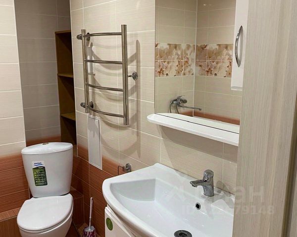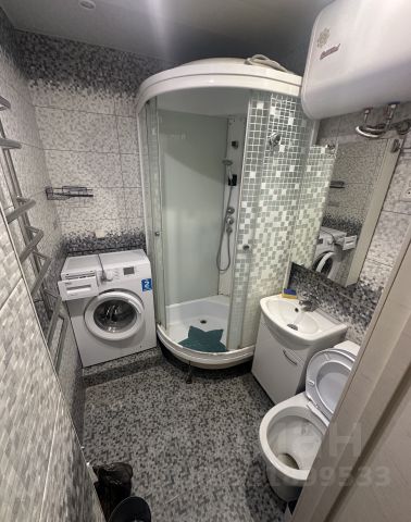 Раздельный санузел. В туалете установлена стиральная машина, водонагреватель и шкаф для хранения бытовой химии, сенсорное мусорное ведро.