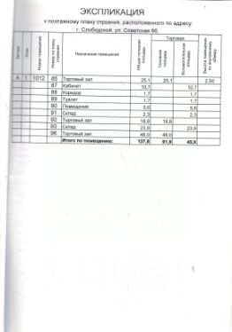 Нежилое помещение в здании по адресу: Кировская область, г. Слободской, ул. Советская, д.66 , общей площадью 137,8 кв.м., для административной, торговой деятельности и оказания услуг